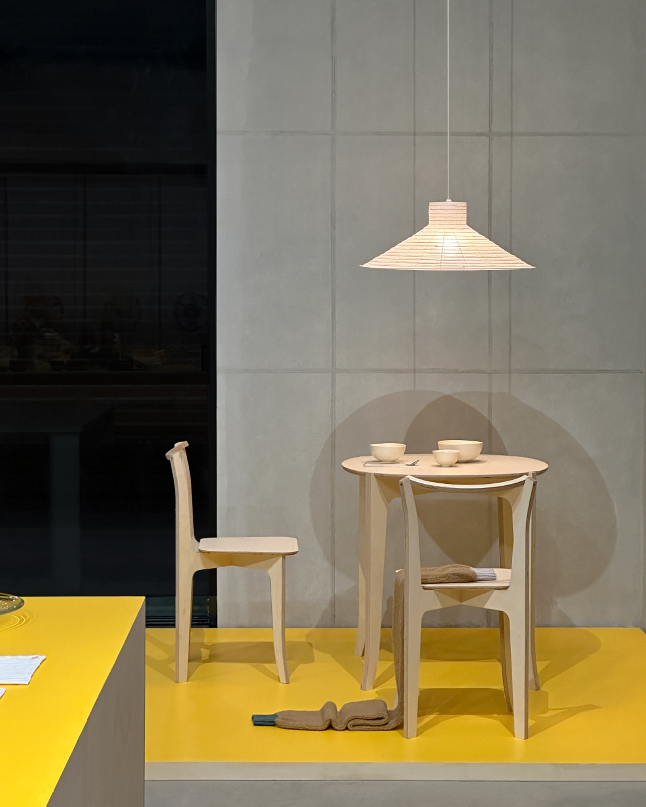 It is designed by carving out the silhouette and proportions spontaneously, with the aim of creating a chair&table with minimal structure that can be manufactured rationally.