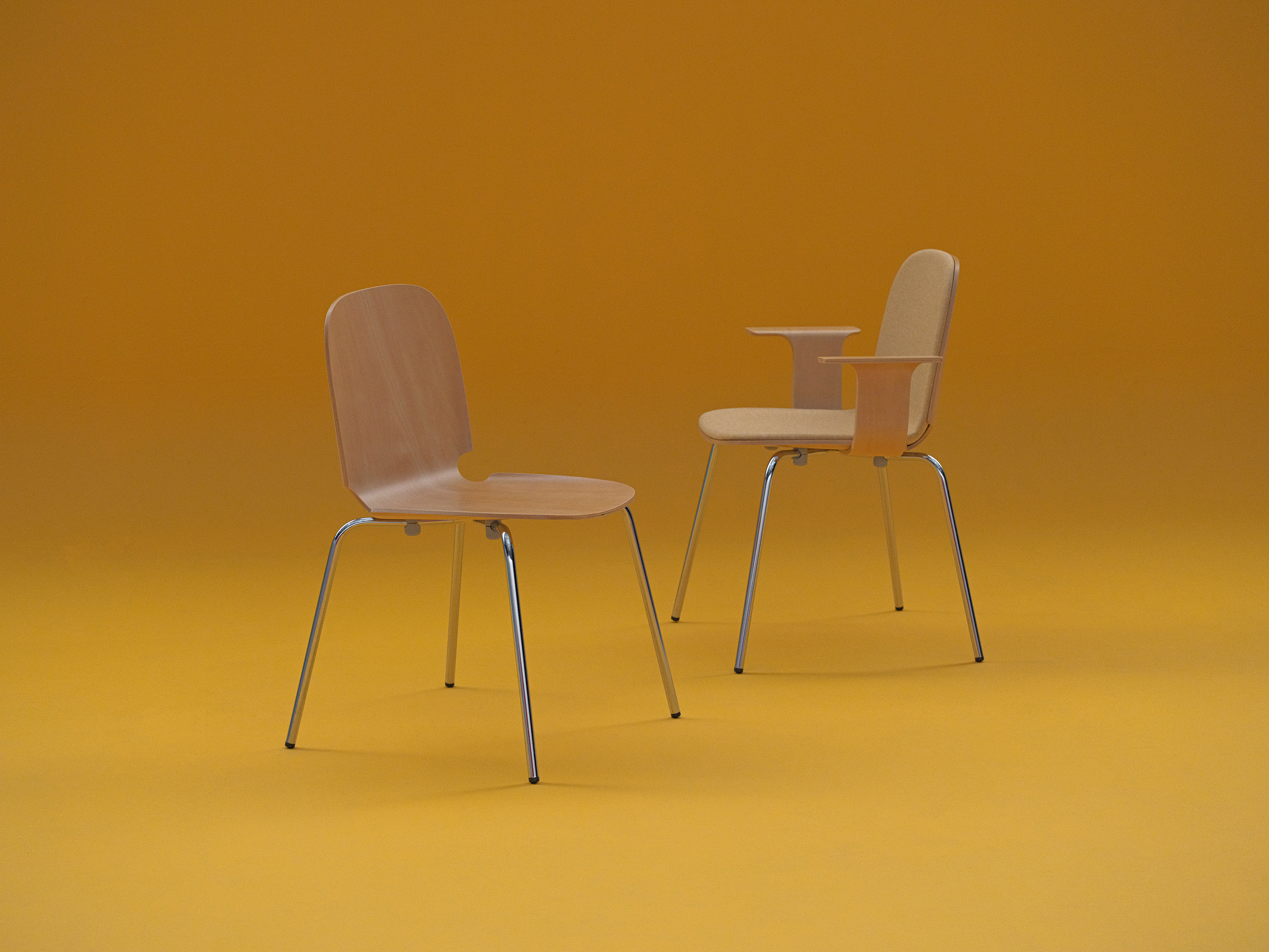 This design combines a comfortable seat shell with a distinctive and stackable four-legged base. The seat and legs of the chair are available in various types of wood with matching finishes. The same module shell can be used together with extensive series that natural or black standard, armrest, castor and fabric covered version.
